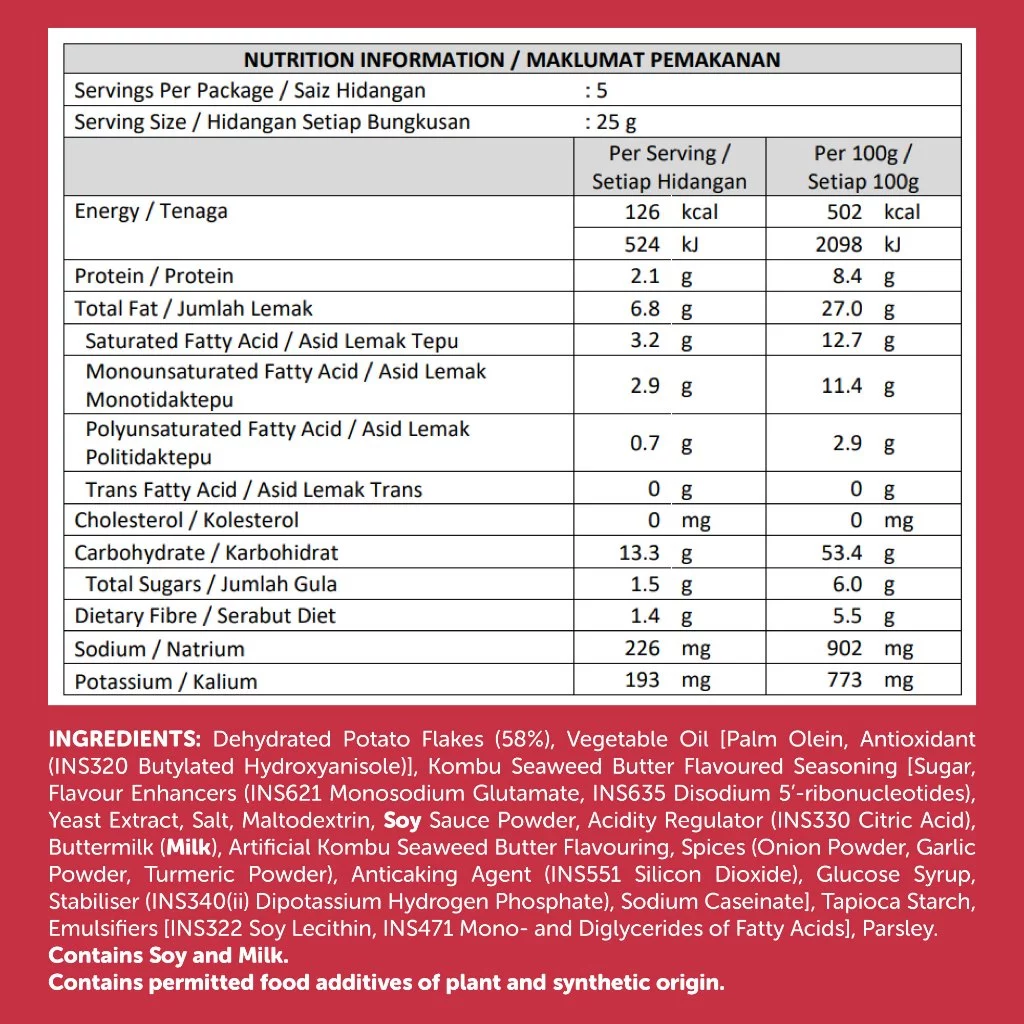 Giới thiệu hương vị: Nguyên liệu được chọn lọc từ nguồn khoai tây cao cấp, kết hợp cùng các gia vị được phát triển độc quyền tạo nên một công thức hài hòa. Từng lát khoai tây được nướng vàng giòn,cùng vị ngọt tự nhiên của rong biển Kombu, và kèm một ít mùi thơm béo của bơ tạo nên một hương vị umami đặc trưng.