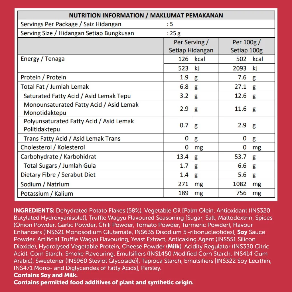 Giới thiệu hương vị: Nguyên liệu được chọn lọc từ nguồn khoai tây cao cấp, kết hợp cùng các gia vị được phát triển độc quyền tạo nên một công thức hài hòa. Từng lát khoai tây được nướng vàng giòn, cùng hương vị đậm đà, độc đáo từ nấm truffle và sang trọng từ bò wagyu mang lại cảm giác thư giãn và tận hưởng trọn vẹn, biến mỗi khoảnh khắc ăn vặt thành một trải nghiệm ẩm thực tinh tế và ấn tượng.
