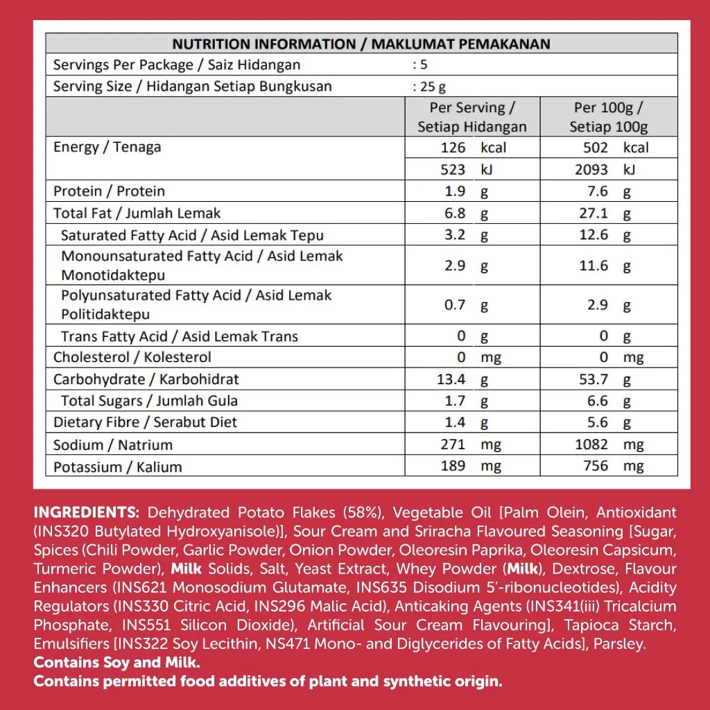 Flavor Profile: Golden, crispy potato slices infused with smooth, creamy sour cream and the signature tangy heat of Sriracha. It creates a perfectly balanced symphony of mild spice and refreshing tartness.